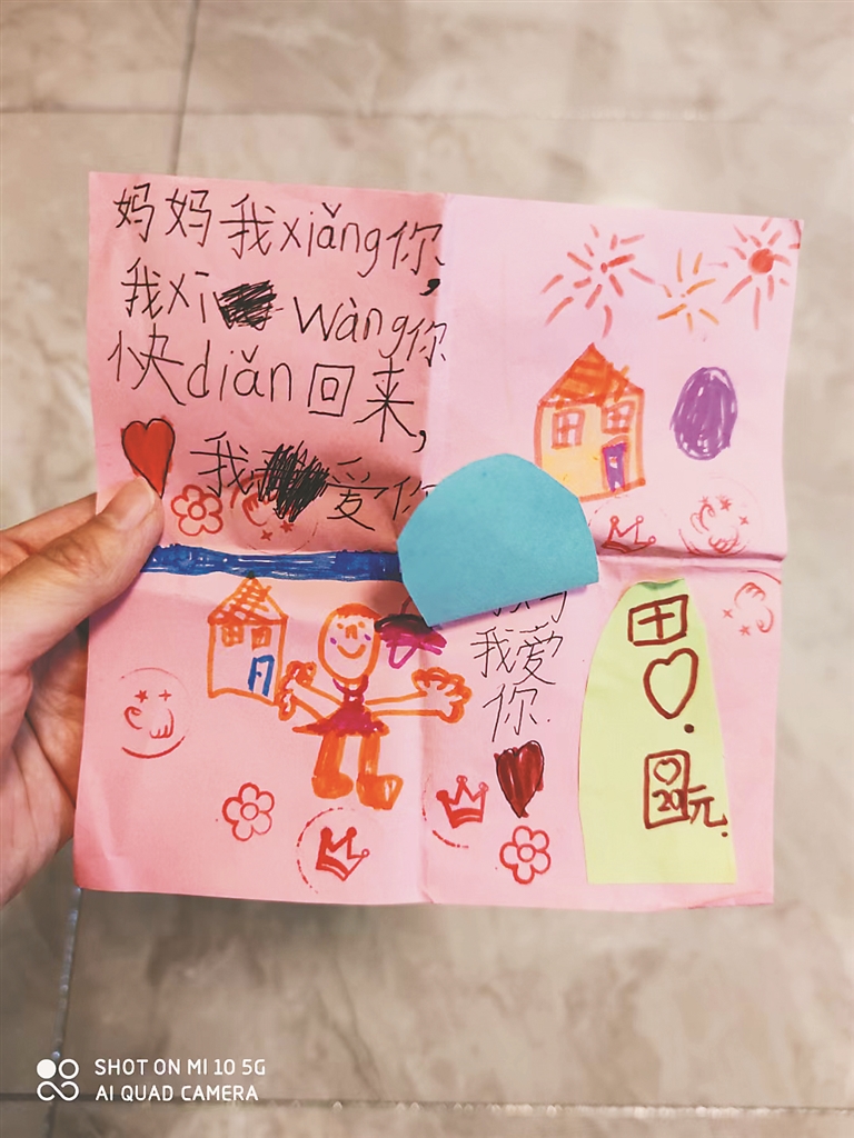 丈夫把小曦的信捎来交给小楠。小楠先是一愣,打开信后眼泪就止不住地往下流。一张粉色的信纸分成四格。左上角写着“妈妈我xiang你,我xi wang你快点回来,我爱你。”右上角画了个小房子和太阳。左下角画了个跳舞的小女孩,右下角则写着“20元”,是女儿送给她的“红包”。