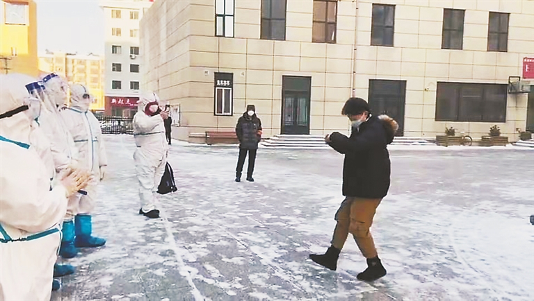 “外面非常嘈杂,没有音响,怎么跳呢?”高新妍灵机一动,把手机放到大衣帽子里,这样能听到音乐。伴着乐声,高新妍跳了起来,每次音乐播放到“听我说,谢谢你”,她就向防疫人员深深鞠躬,对面的防疫人员也同样鞠躬回礼。“我给他们鞠躬是正常的,没想到他们还给我鞠躬,我的眼泪在眼圈打转。”