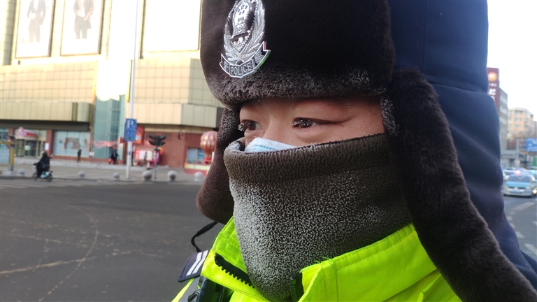 24日,室外温度零下22℃,早上天还没亮,齐齐哈尔市公安局交警支队建华交警大队辅警胡国亮早早出门,来到他负责的百货大楼岗地开始执勤。站在道路中间,忙于指挥交通的他动作干净利落,一个早高峰结束后,他的两条腿冻得发麻,执勤服都冻得硬邦邦。