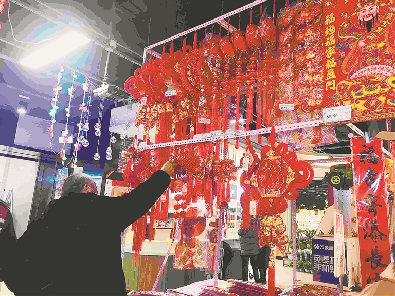 记者看到,超市入口已被红火的节庆商品装点一新,走近年货饰品区,红对联、中国结、红灯笼等已摆满柜台。干果、酒水区域也增加了不少节日礼盒,红红的颜色显得节日气氛更浓。