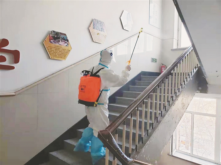 26日,社区核酸检测点撤点,二人又参与了终末消杀工作,背着40斤重的消毒液,对大方里小学和道外少年宫两个检测点共10层楼进行了全面消杀。顺利完成了消杀工作后,换下防护服后,两人衣服已全部被汗水打透。