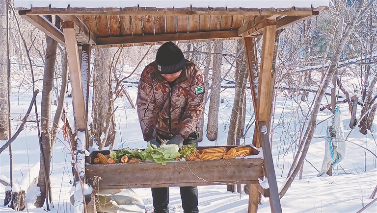 在降雪较集中和有蹄类动物分布较密集的地点,林场所的工作人员根据自然条件就地取材,制作了不同的补饲架及补饲槽,投放了盐砖、桔杆、玉米、萝卜、白菜等越冬食物,并派专人检查和记录饲料的消耗情况,以便及时更换和添加饲料。同时,还有针对性地做好对补饲点周围有蹄类动物实体以及活动痕迹的监测与记录,掌握动物种群活动轨迹和规律。