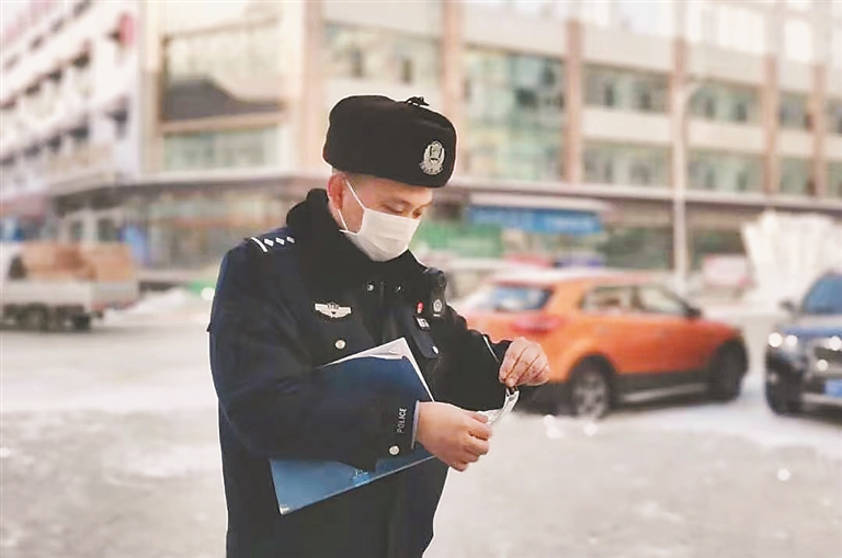 “你们店天天消杀工作做得挺好,挺细致,往咱们那个群里发一下,好给大伙做个示范!”“一定每人都得扫两个码(健康码、行程码),有啥事第一时间找我!”早晨9点,东莱街派出所民警林阿明早早开始对他辖区内的商户逐一检查防疫工作,叮嘱防疫要点。室外零下20℃的低温,不一会儿,就将林阿明的耳朵、手都冻得通红,口罩上也结了一层厚厚的霜。“我的警区是30家商铺,走下来得一个多小时,每天怎么也得走个1万步吧!”林阿明说,辖区内都是老旧小区,老年人多一点,总共是460户1166人,下片数据采集的时候发了个名片,还有居民微信群,如果有啥变动,比如说出租房东有变动,居民们都会第一时间跟他联系沟通。