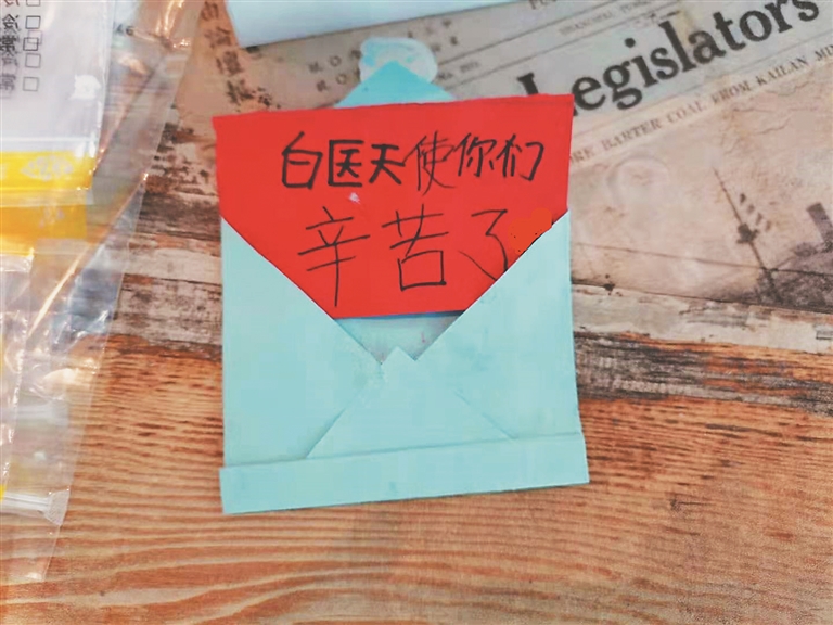 1月19日当天特别冷,气温零下二十多摄氏度,吴广生和另一名医护人员一起在齐齐哈尔金茂府小区为居民采集核酸。大约是上午10时许,一个只有五六岁的小姑娘,被家长抱着送来一封慰问信。信是小姑娘亲笔写的:“白医天使你们辛苦了。”后面是一颗心,没有名字和落款。据吴医生介绍,回到家之后打开一看,他和爱人的心立即就被萌化了,感到眼眶热乎乎的。