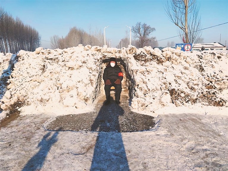 为什么坐在雪洞中值守卡口?黄大爷说,“前两天气温下降,西北风,挺冷的,我就寻思在雪堆这儿扣个窟窿,挡挡风,也就一个多小时我就扣出来了。还真别说,拿个椅子在里面坐着,背风,真挺暖和。要不然这守卡点就得用车,搭帐篷也得花钱烧煤取暖,这天然雪洞能给国家省点钱。”