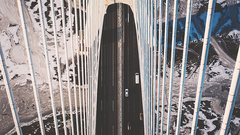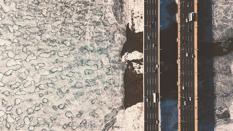 在所有冬景中,王嘉熠说,他最喜欢用无人机拍摄封冻的江面。“很多人都是站在江边的台阶上看江面,白茫茫的一片,没什么惊艳之处。但如果从无人机的角度俯瞰,就会发现冰面上大自然的纹理,每年都不一样,感觉像是宇宙全息论所说的那样,它很像是我们的指纹,或者一些皮具上的纹理,十分奇妙。”