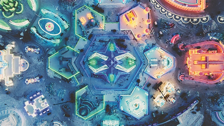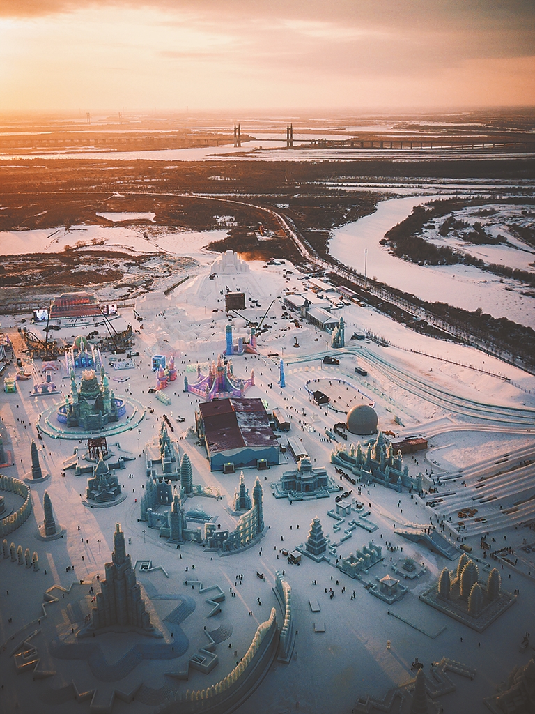 白天,当无人机起飞后,高大的冰雪建筑渐渐变得渺小,整个世界宛如一个水晶沙盘。傍晚灯光点亮,辽阔的大地上仿佛绽放着朵朵色彩斑斓的冰花……不久前,25岁的冰城小伙王嘉熠拍摄的一组哈尔滨航拍照片,登上了上海《外滩画报》,被无数网友点赞。