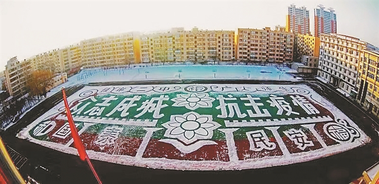 作画的是佳木斯二中保安李志。李志告诉记者,1月24日佳木斯下了一场雪,他在学校值班,闲来无事,看着雪后的操场就像一张大画布,就有了在上面作画的想法。“画什么呢?抗疫主题的吧。”李志说干就干,拿起铁锹开始“作画”。没有图纸,他全靠步量,用两天时间完成了画作。