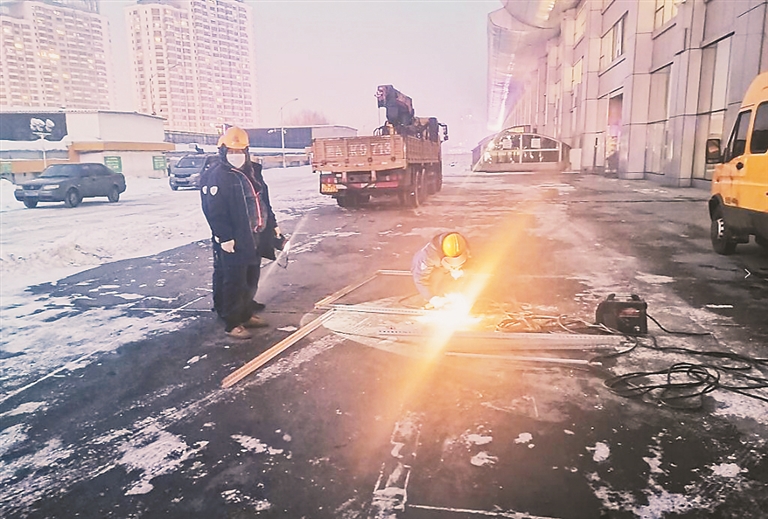 据现场施工负责人贾立竹介绍,在“火眼”实验室内进行安装转接箱和敷设电缆的作业都是比较困难的。实验室是布置在会展中心内,里边墙壁的材质是空心板材,施工人员无法安装固定电缆转接箱,只能采用角钢焊接搭建框架来固定电缆转接箱。在两个核酸检测气膜版“火眼”实验室之间只有一个人的侧身宽度,展放电缆时要异常的小心,稍加不注意电缆的顶端就会刮碰到气膜版,容易刺破气膜。由于会展中心管内无法动火,施工人员焊接搭建框架只能在零下30℃的室外进行。
