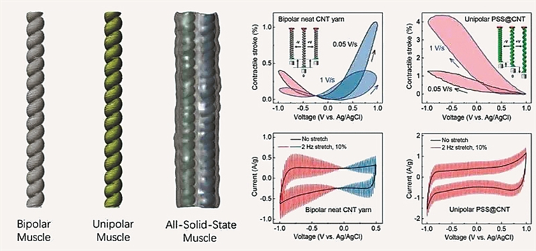 该研究首次发现通过聚电解质功能化的策略,可实现人工肌肉智能材料的“双极”驱动转变为“单极”驱动,同时发现了人工肌肉随电容降低,驱动性能增强的反常现象,这一重要发现和突破为人工肌肉后续应用展示了更广阔的前景。