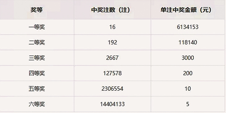 本期二等奖开出192注,单注金额11万余元;六等奖开出1440万注。