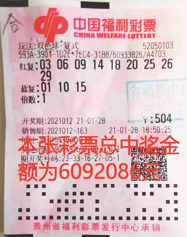 1月28日,中国福利彩票双色球游戏进行第2021012期开奖,贵州凯里市彩民凭借一张9+3的复式票,一举夺得当期双色球一等奖1注,二等奖2注以及固定奖若干,奖金共计6092086元。