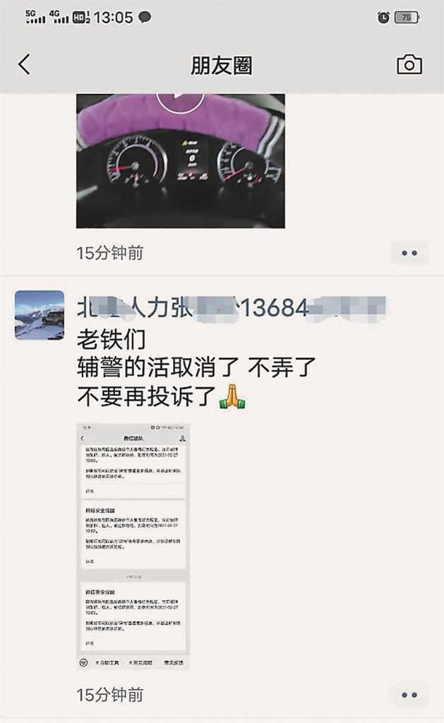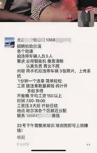 在网传的朋友圈截图中记者看到,名为“北X人力张XX”发布的朋友圈显示:“招聘哈尔滨各个街道拍违章车辆人员5人。要求会智能机、像素清晰。用手机拍违章车辆3张照片,上传系统。1分钟一个违章,简单轻松。工资按照违章数算钱,纯计件,多拍多得,不偷懒,(日)平均工资150元以上。哈尔滨各区就近分配。”