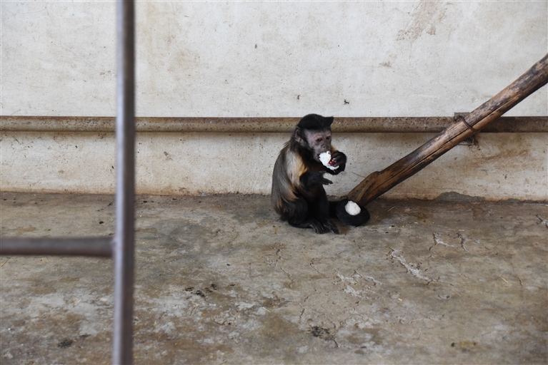 小悬猴们遇到好吃的当然要各凭本事,先到先得。抢好吃的,一群小猴子谁也不服,就服黑帽悬猴“毛毛”。抢多了爪子拿不了的时候,尾巴还能再多拿一块,论搬运能力是悬猴中的战斗机。它爪子灵活,速度快,尾巴还能当手用。“毛毛”尾巴夹着一个大元宵,双脚微缩保持警惕,手捧元宵大快朵颐,大眼睛滴溜溜转,吃个元宵可爱值爆表。