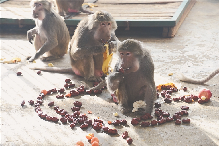 年轻的阿拉伯狒狒们延续一贯的土匪风格,一拥而上,一大堆元宵瞬间抢光。狒狒群中的小首领“酋长”一屁股坐在元宵最多的地方,双手一搂,圈中的都归自己所有。其余的狒狒们不敢和首领争夺,马上哄抢剩余资源, 一个个捧得双手满满,撑得颊囊鼓鼓,元宵吃得十分欢腾。