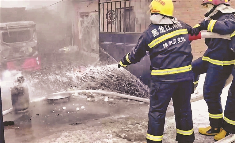 据悉,当日13时50分许,呼兰区北大街杜家胡同里一处民房突然起火,浓烟在房屋上空升腾,火势眼看要蔓延至隔壁的房屋。有人报警后,辖区消防部门迅速赶到。此时,大火已将港田车烧毁,车后的房屋也开始冒烟。就在这时,有居民突然喊到,火场内还有一个煤气罐好像也着了。消防人员发现,一个煤气罐正向外喷着火舌。消防人员立即疏散周围人员,用高压水枪向喷火煤气罐打水降温,随即,一名消防员冲了上去。