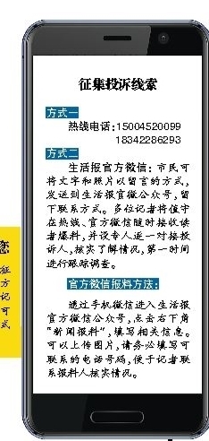 生活报官方微信: 市民可将文字和照片以留言的方式,发送到生活报官微公众号,留下联系方式。多位记者将值守在热线、官方微信随时接收读者爆料,并设专人逐一对接投诉人,核实了解情况,第一时间进行跟踪调查。