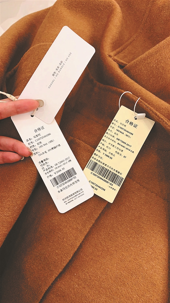同一件大衣俩吊牌不同价 羊毛含量标注也不一样