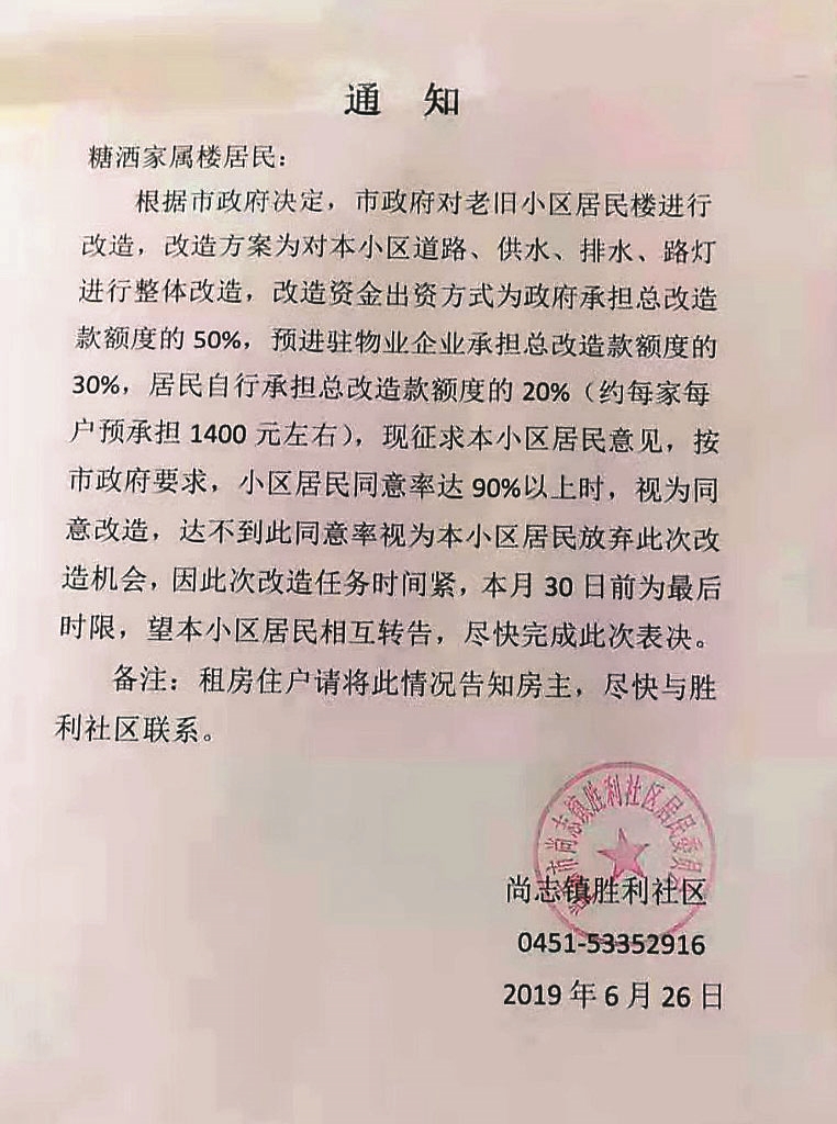 记者在居民提供的图片中看到,一份由尚志镇胜利社区在2019年6月26日发出的《通知》,根据市政府决定,市政府对老旧小区居民楼进行改造,改造资金出资方式为政府承担总改造额度的50%,预进驻物业企业承担总改造额度的30%,居民自行承担总改造额度的20%(约每家每户预承担1400元左右),现征求本小区居民意见,按市政府要求,小区居民同意率达90%以上时,视为同意改造。