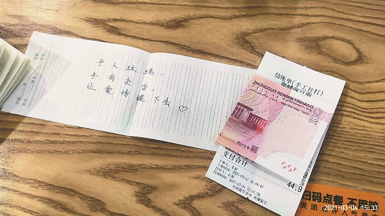 3月1日中午,一对夫妻带着孩子吃面,支付了餐费后,又偷偷在桌上留下了100块钱,同时留下一张字条。赵继民说:“看到字条上写的字,我很感动。”这张字条他们还留着,记者看到,纸条是一张小学生用的四线格纸,上面写着,“予人玫瑰,手有余香,让爱传递下去。”纸条里夹着一张百元钞票。