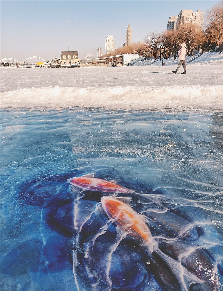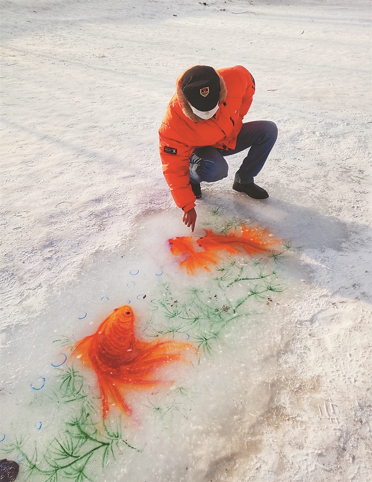 2月23日,一幅《鱼戏松江》图出现在哈尔滨松花江九站码头附近的冰面上:两条大红鲤鱼,鱼鳍张开,在松花江上游动,涟漪一圈圈向四外荡去,画作栩栩如生,两条鱼就像刚刚冻在江中一样,这吸引了不少过往市民围观,引起一片啧啧赞叹。