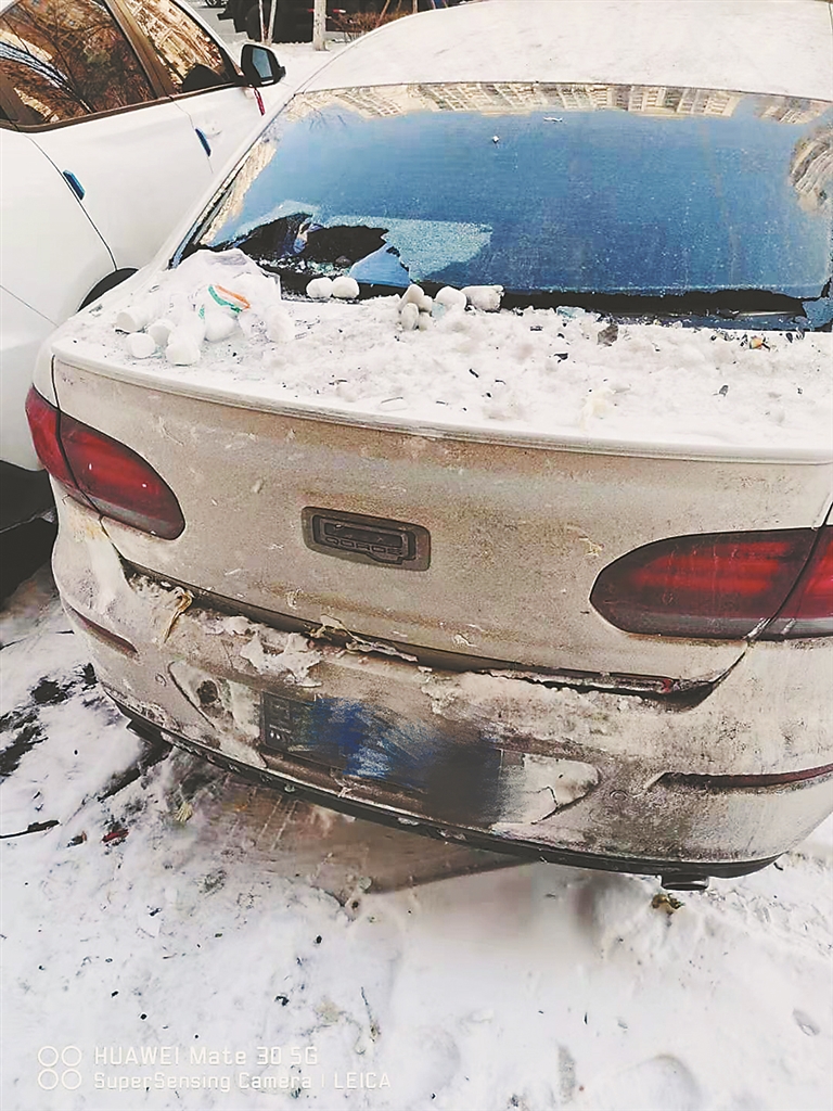 再看爱车,后挡风玻璃被黏豆包砸出一个大窟窿,玻璃碎片崩得到处都是,轿车的两侧尾灯都被砸碎,后盖是大大小小被黏豆包砸出来的坑,一个黏豆包还插在尾灯的碎茬上。