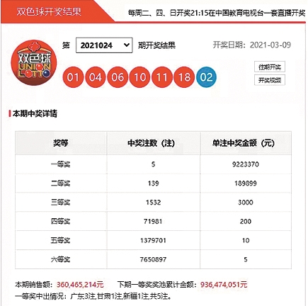 3月9日晚,中国福利彩票双色球游戏第2021024期开奖。本期双色球红球号码为01、04、06、10、11、18,蓝球号码为02。