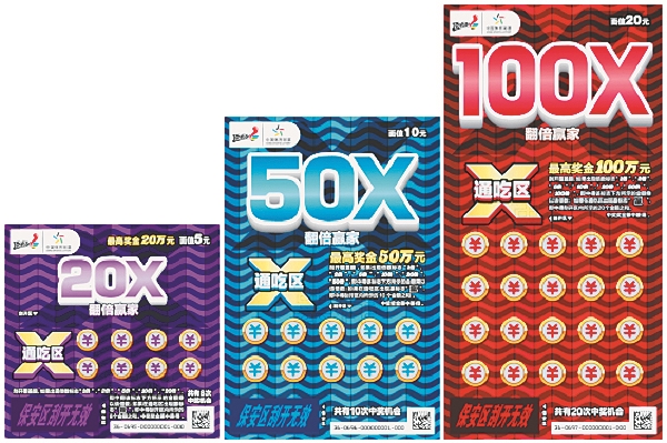 据了解,“翻倍赢家”系列即开票共有3款面值,分别为5元、10元和20元,票面颜色分别为紫色、蓝色和红色,主元素分别是“20×”、“50×”和“100×”,与各自游戏奖金的最高翻倍数相呼应。三款面值的“翻倍赢家”即开票头奖设置丰厚,中奖机会多,采用找翻倍符号+通吃的玩法。具体游戏规则为:刮开覆盖膜,如果出现倍数标志,即中得该标志下方所示的金额乘以该倍数;如果在通吃区出现标志“赢”,即中得刮开区内所示的金额之和。中奖奖金兼中兼得。