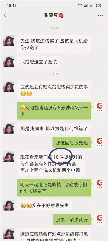 记者看到在王先生与京东客服人员的微信聊天记录中,京东客服人员也明确说了:“现在看来我们的10件货是对的,每个套装有3件货,总共两套,再加上两个洗衣机和两个电视”。