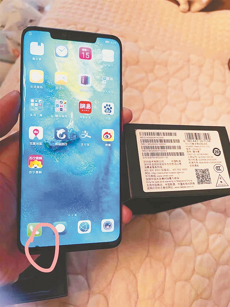 15日,李先生告诉记者:“2019年,因工作表现优异,我获得单位奖励华为mate 20 pro手机一部。当时因有其他手机在使用,新手机就一直未开封。今年3月12日,因老手机老化,我决定用新手机。打开包装开机后,我发现手机屏幕左下方有一黑色圆点,于是,我按照手机包装盒上所示,致电华为售后服务电话,并来到华为授权服务中心进行检测。”