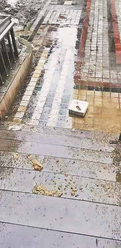 9时许,记者一进到张女士家的楼道就看见,楼道电表上方的排污主管线确实有不小的水流,成了“水帘洞”,顺着楼梯一直淌到地面,单元门与楼梯之间的地面已经充满积水,如果要出行就要踩着临时用木梯子和砖头搭起来的“小桥”。张女士告诉记者,第一天漏水就有业主去报修了,但是物业以没有替换水管为由不予修理,随后几天业主们纷纷找物业,物业两次来进行简单处理,换了管子但是每次都是中午刚修好,下午或者晚上就又漏水。
