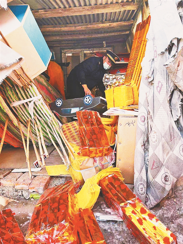 在哈双路王岗地区,排查人员走访哈双路天堂寿衣纸花丧葬用品店时,发现一扇小门。排查人员询问门后是什么,店主表示,门后是洗手间。排查人员要求店主打开门后,发现门口是一条过道,直通店面后的居民楼。在过道内一侧,存放了大量冥纸冥币。通过过道来到店面后的小区,小区内一处临时搭建的储藏室内也堆积着冥纸。对着储藏室的居民楼道一楼一层,也堆积着冥币。市场、执法、民政、派出所等部门开展联合执法行动,现场收缴冥纸冥币祭祀用品近200公斤,责令经营商家立即关停。