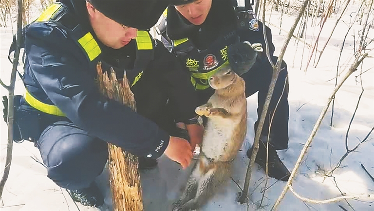 生活报讯 (记者栾德谦) 随着天气转暖,森林中的野生动物也都活跃起来,许多不法分子也打起了它们的主意。17日,鸡西边境管理支队桦木林边境派出所民警在鸡西金刚台林区开展巡逻清林行动。在一处林地,民警们发现有一只野兔被捕兽套套住,野兔用尽力气也挣脱不得。民警们迅速围拢过来,解开了套在野兔身上的捕兽套。