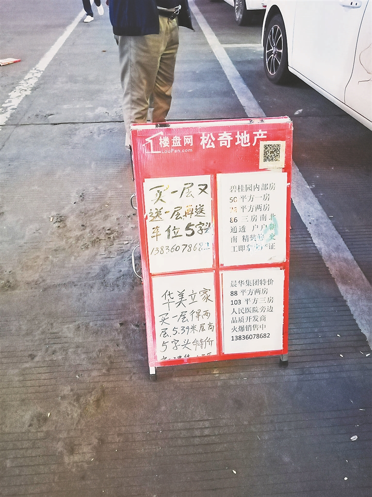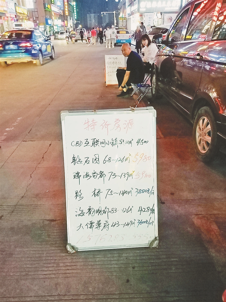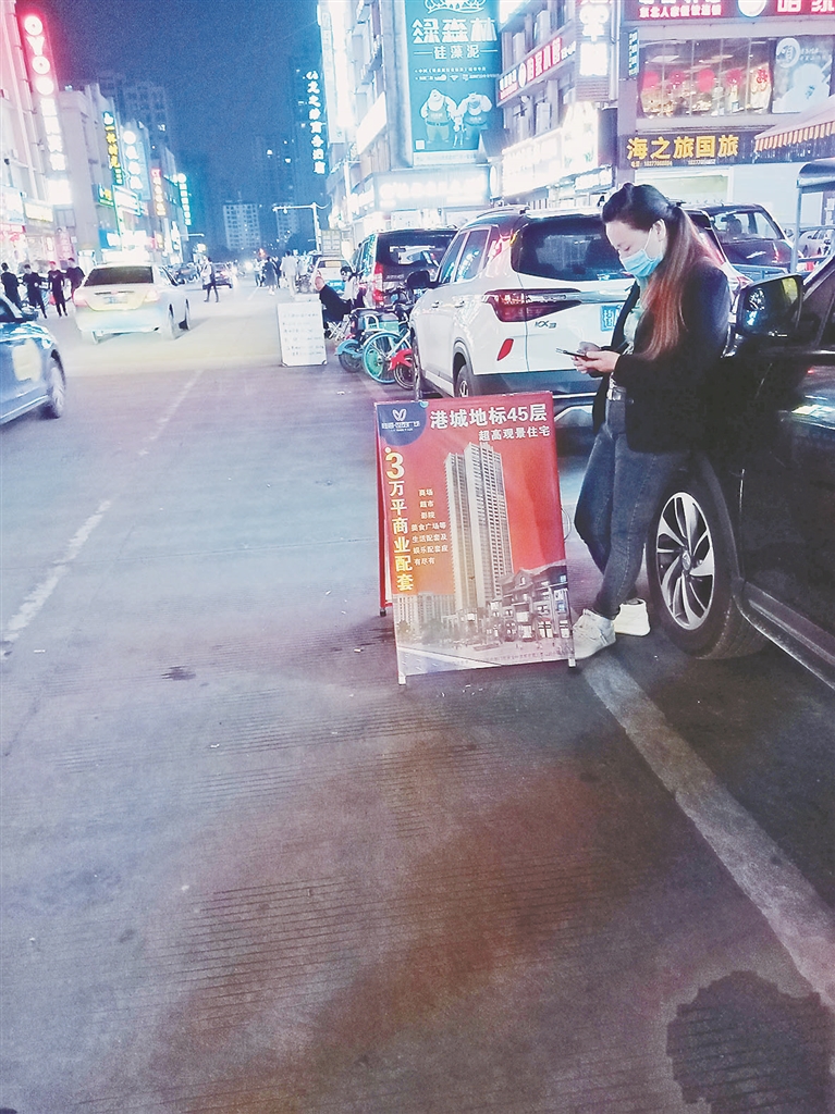 随着夜幕降临,逛街的、散步的、吃宵夜的……川流不息的人群让伏波路热闹起来,而人流中夹杂着推销楼盘的房产中介人员,街路两侧则几步就有一处房屋中介的小摊,很多中介人员不时向路人打招呼,招揽生意,推销房子,更传授买房赚钱的“秘籍”。