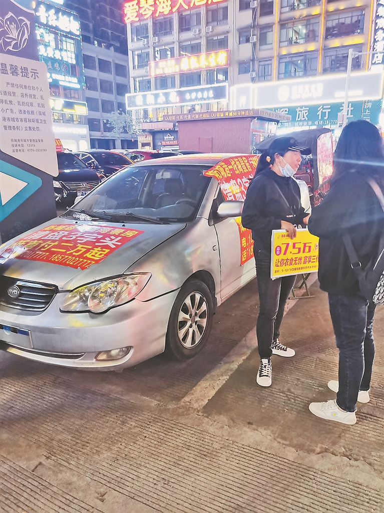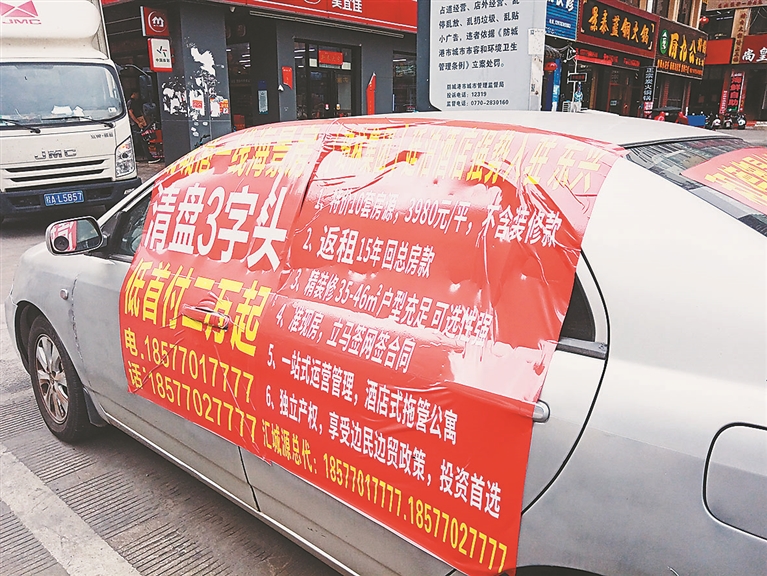 采访中记者看到,防城港街上的食杂店、美发店等场所都贴着卖房信息,街边摩托车上放着卖房的广告,甚至停在街边的汽车外都张贴着卖房广告,而卖房也不仅仅是房屋中介、售楼处在做,就连网约车司机、美发厅老板、饭店厨师都称“只要想买房,就能给介绍房源”。