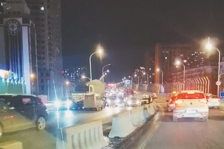 视频显示,两人坠桥后,有路人自发在坠桥人前面引导车辆绕行,防止发生二次事故。而另一人在二环桥上看到,南直路和公滨路交叉口的二环桥上,两辆轿车发生事故,停在靠近分车带的路中央,靠近桥边一台水泥罐车与一辆SUV相刮贴在一起。水泥罐车前后还各有一辆面包车。