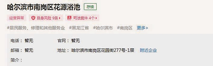 22日,记者来到花园街277号看到,此处招牌已被拆掉,大门锁着,屋内无人。附近上班人员告诉记者:“他家早关门了,现在根本找不到人。”宋先生给记者提供了他查到的该浴池的工商注册信息,记者查询到,该浴池目前状态为存续,但该企业已经被列入经营异常,且存在9条风险与4个司法案件。