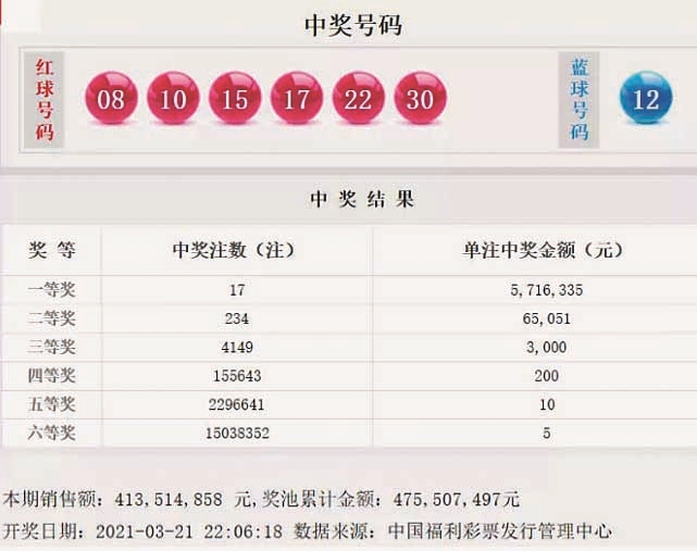 据中彩网报道 3月21日晚,中国福利彩票双色球游戏进行第2021029期开奖。当期双色球红球号码为08、10、15、17、22、30,蓝球号码为12。