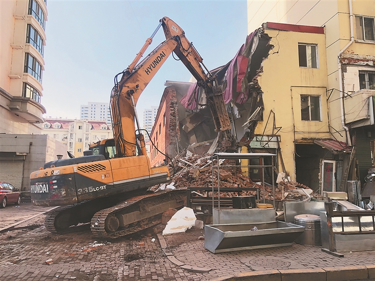 拆除当天,道里区执法局、道里分局、区公证处、新华街道办事处的工作人员开始协助房主搬离屋内物品,并对其财产进行了依法公证。随着铲车的轰鸣声,乡政街90号的违法私建被拆除。