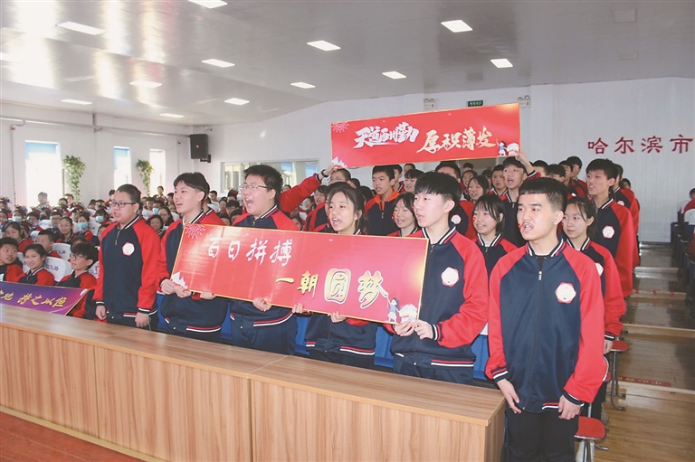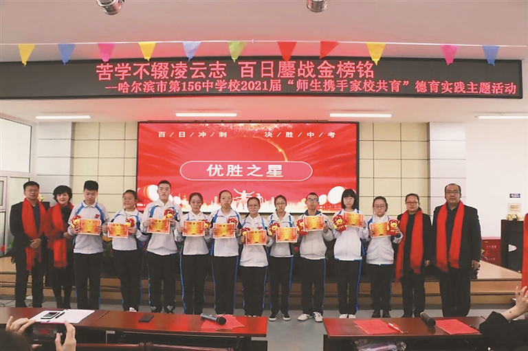 哈尔滨市第156中学校举行以“苦学不辍凌云志 百日鏖战金榜铭”为主题的中考百日誓师大会,为中考冲刺吹号角、振精神。