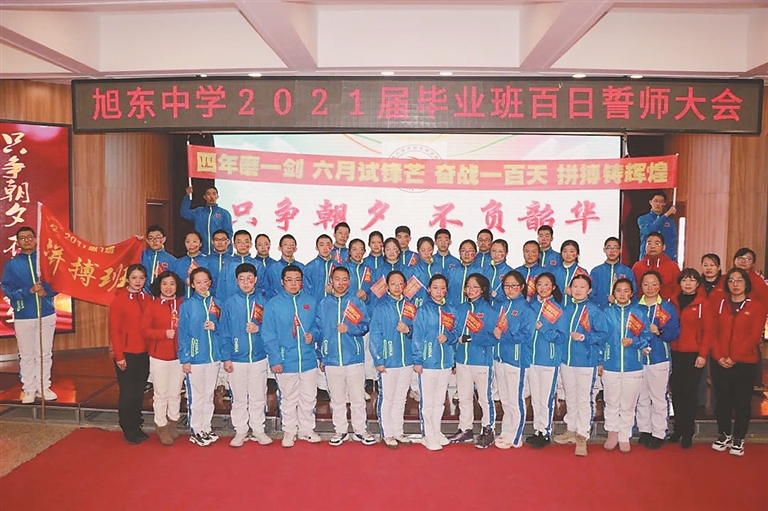 旭东中学以“只争朝夕,不负韶华”为主题,召开2021届毕业班百日誓师大会。毕业班全体师生和家长代表欢聚一堂,共同为全体毕业生加油鼓劲。