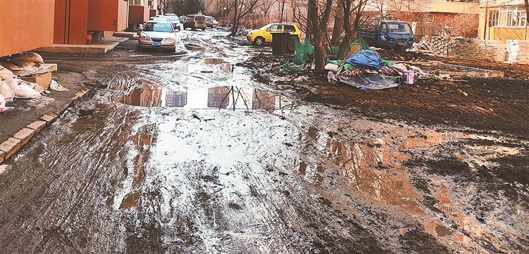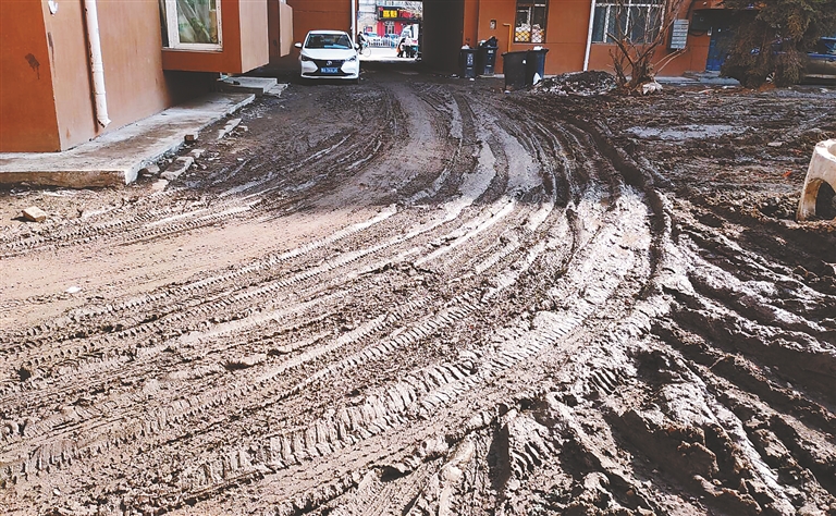 住在河松小区的王先生说:“这两天开化了,楼下的雪全化了,小区还没改造完,地上全是泥,根本没法走人,太闹心了。”24日,记者来到河松小区发现,301栋楼下整条人行道完全变成了“水泥路”,大水坑堵在单元门口,没有水坑的地面上不是一层泥就是一层冰,确实如王先生所说,根本没有下脚的地方。在这里通行必须小心翼翼,一脚踩偏了就容易踩得满脚泥,出行非常困难。在301栋楼后,路面上全是车辙痕迹的稀泥,只有中间不到50厘米的一条很窄的路面是干的。