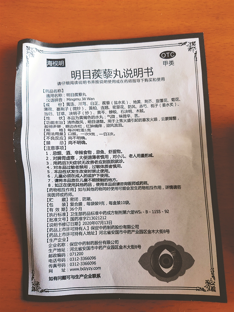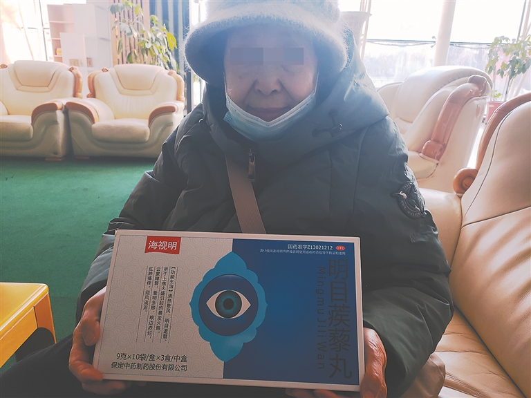 李阿姨说:“我说要退货之后,他们就把我电话拉黑了,我怎么也打不通了,一打就说通话中,根本没人接。”李阿姨今年86岁,眼睛看不清东西,被确诊为黄斑变性、眼底出血、玻璃体混浊和白内障晚期。因此,李阿姨对治疗眼睛的药格外关心。今年2月,在广告中听到“海视明明目蒺藜丸”的宣传后,她十分心动。李阿姨说,广告中提到这药是从海洋里提取的活性肽是小分子肽,能直达眼底病变细胞,药方是保密配方,90天治一个好一个。“我当时就觉得这药真厉害。买4盒赠2盒,一共1360元,能用90天,我就买了一套。”李阿姨说。
