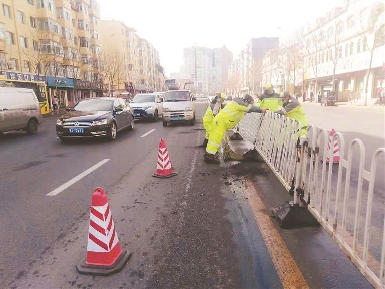 “一、二、三,使劲儿抬,好啦好啦,快扫吧。”近日,在哈尔滨道外区的街路上,远远就能听到环卫工的吆喝声,原来是环卫工王鹏组织队员们正在作业,清理南十四道街隔离护栏固定墩下累积了一个冬天的泥土。