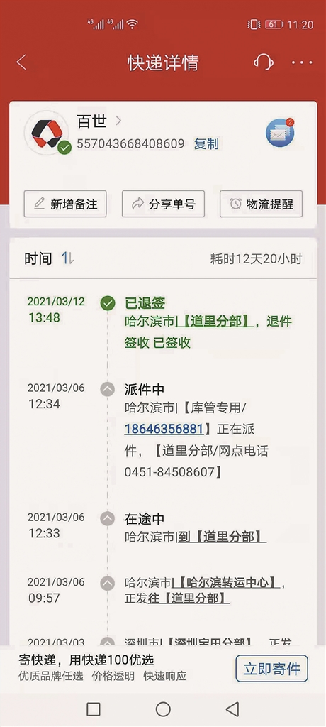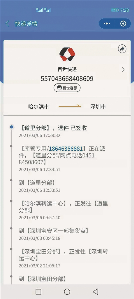 王先生介绍,快递于2月27日被百世快递道里分部揽收,3月3日包裹到达深圳宝田分部。这时王先生要求退货,3月6日12时许,快递信息显示包裹到达哈尔滨转运中心,发往道里分部。王先生着急把东西取回来,就去道里分部取件,但是工作人员找了半天也没找到,告诉王先生,包裹可能在香坊的大库。王先生觉得香坊有点儿远,就没去。6日17时许,快递信息显示已被道里分部签收。