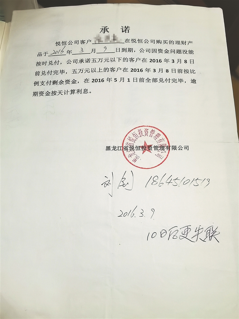 2016年3月9日到期日,当他找到这家投资公司时,发现公司既不返利,也不给本金了。该公司给其一张加盖公章的“承诺”,其中称:旁先生在该公司“购买的理财产品于2016年3月9日到期,公司因资金问题没能按时兑付……公司承诺五万元以下客户……在2016年5月1日前全部兑付完毕,逾期资金按天计算利息。”然而,第二天3月10日旁大爷再去找,就发现公司人去楼空,工作人员也联系不了。