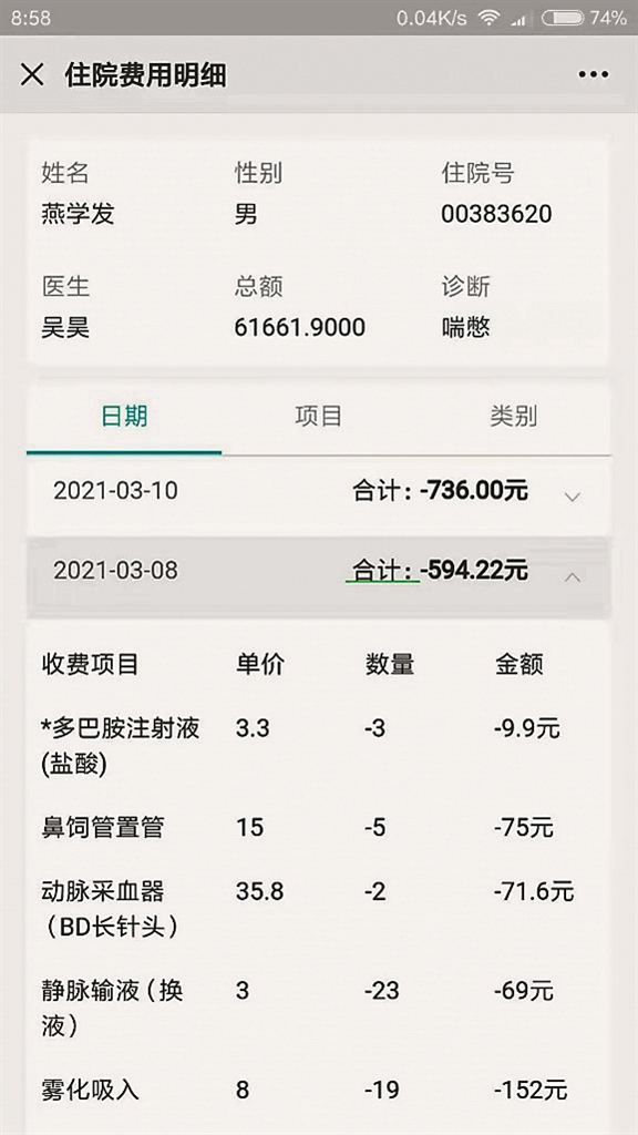 就在双方就此事各执一词时,去世老人的账户清单又发生了变化。记者看到,住院费用明细显示,3月8日,患者的账户被减掉594.22元,10日被减掉736元,12日和13日分别被加上了68.8元,14日又被减掉137.6元。记者对了一下账单,发现8日患者被减掉的594.22元中,多巴胺注射液(盐酸)3次,共计9.9元,在1月5日的日清单中出现过。