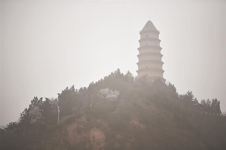 28日,延安市地标宝塔山笼罩在沙尘中。