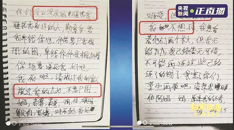 专题片中播放了一名被害人生前自拍的遗言视频,视频中一名男性被害人哭着说:“每天每天每天每天地还,我真的受不了了。爸,妈,如果还有来生的话,我做牛做马报答你们,儿子真的顶不住了。只想早点儿死,早点儿解脱。”