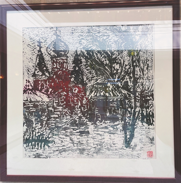 据介绍,冰版画是用冰做版画的模版,用刀和其他辅助工具在模板上用宣纸拓出版画。其艺术创作的形式和铜版画、木版画、石版画有所不同,材质全部是用冰完成。每一张版画随着冰块的融化印出来的效果都有所不同,因此每张冰版画几乎都是“绝版”。此次展出的“初春的教堂”,是朱晓东于2015年创作的。画面中独具特色的老房子、雪原中的小屋以及充满俄罗斯风情的教堂,都体现了独特的北方韵味。
